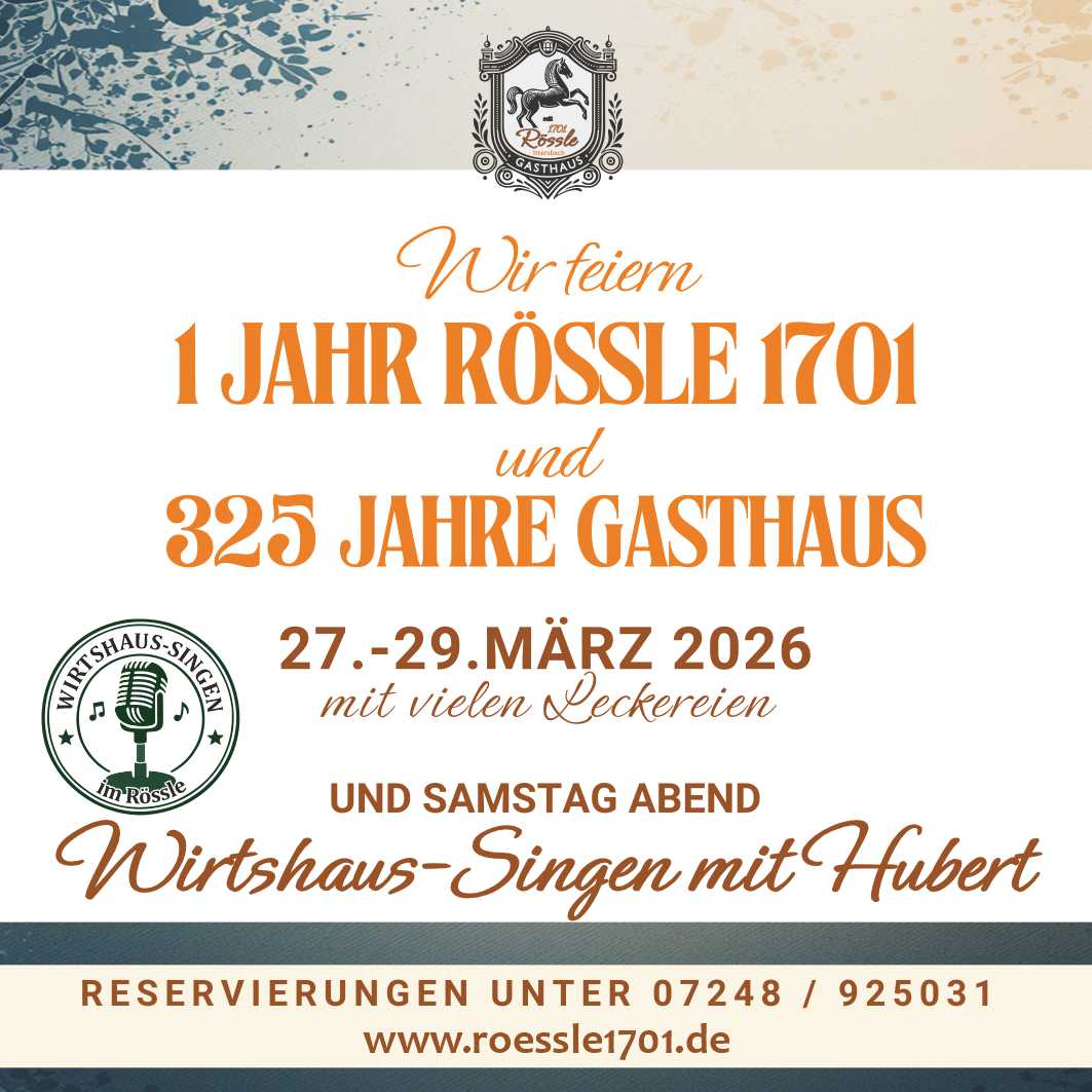 1 Jahr Rössle 1701 und gleichzeitig 325 Jahre Gasthausgeschichte in Ittersbach. Am Samstagabend laden euch wir zum Wirtshaus-Singen mit Hubert ein.