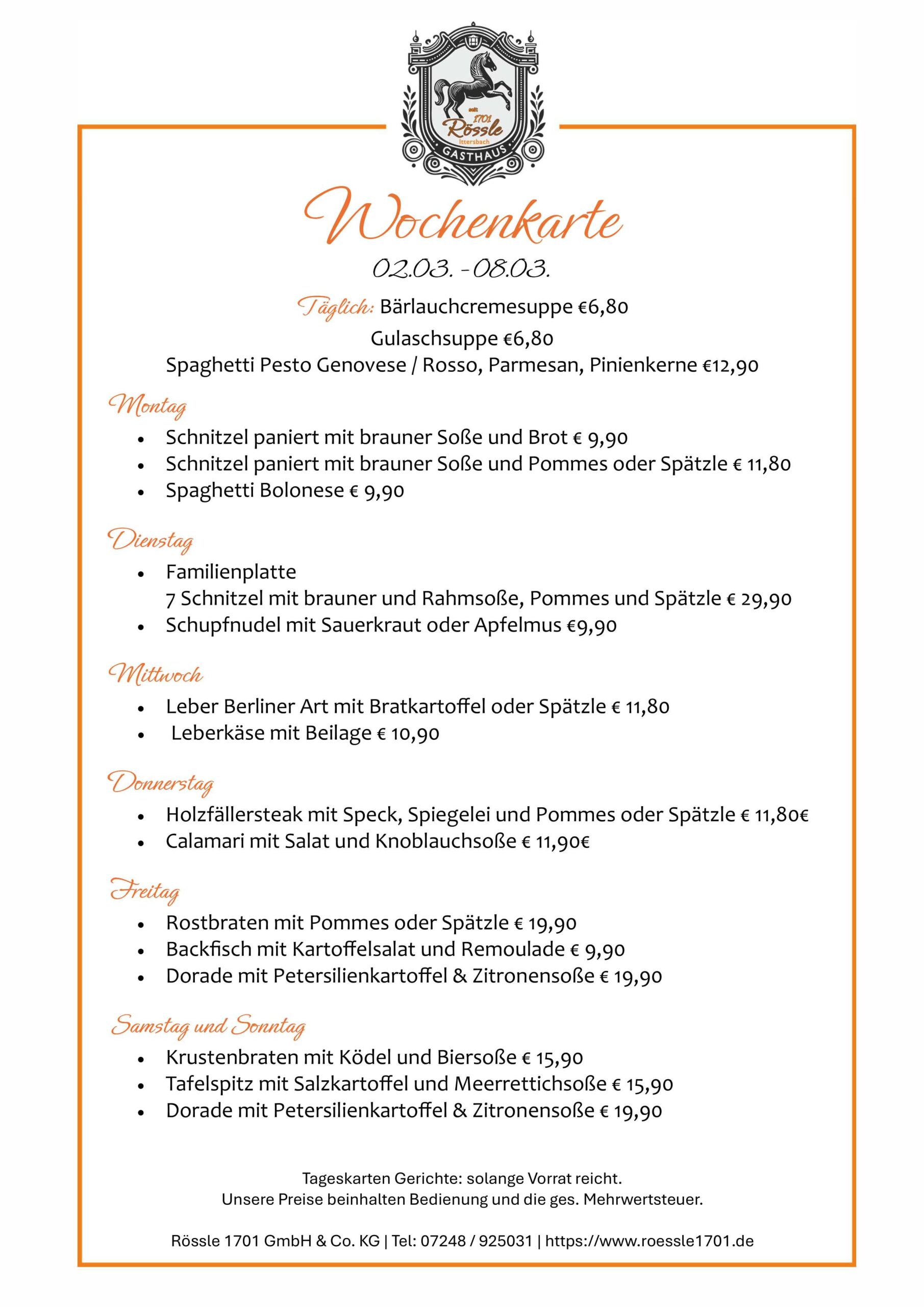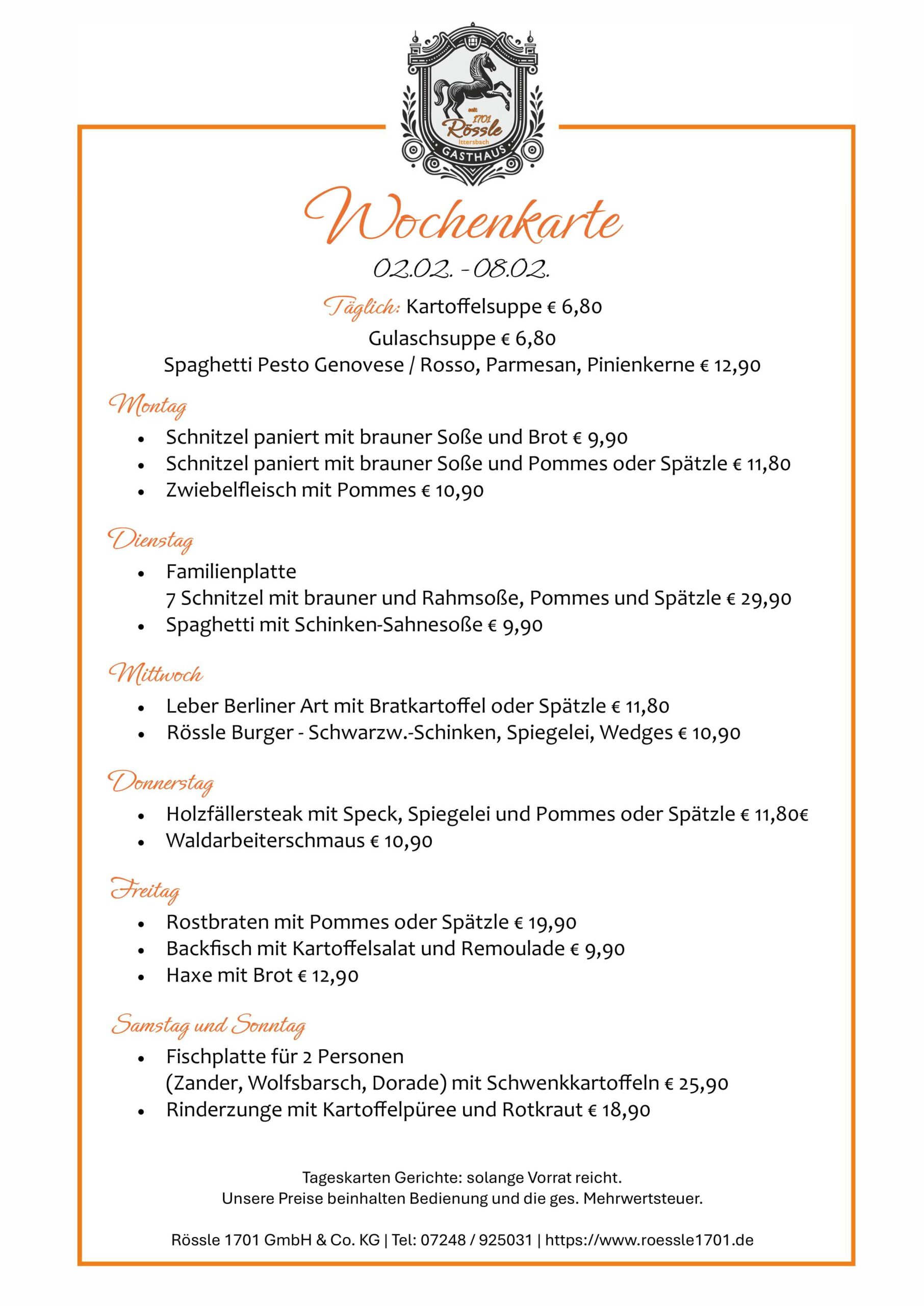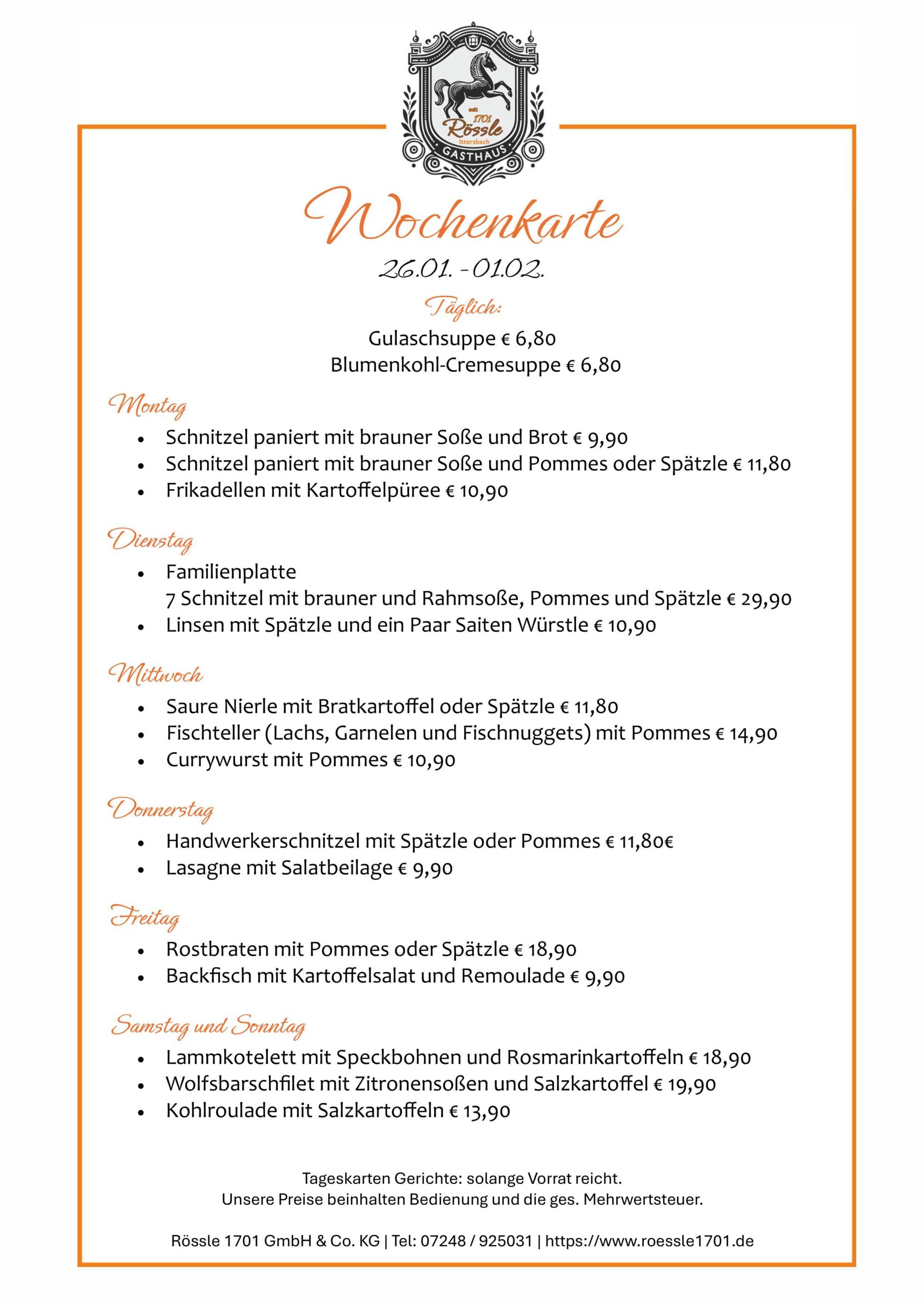 Hier finden Sie unsere aktuelle Wochenkarte mit täglich frisch zubereiteten Gerichten.